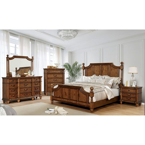 Classic, almost farmhouse, in its appearance, this bedroom collection showcases how even natural tones can pop out in a room. The paneled bed is held by four beautifully turned posts that ooze with pastoral elements. The accompanying case goods sit peacefully atop round bun feet that taper to a point. A prominent wood grain eases the lavish design details into its homey state.