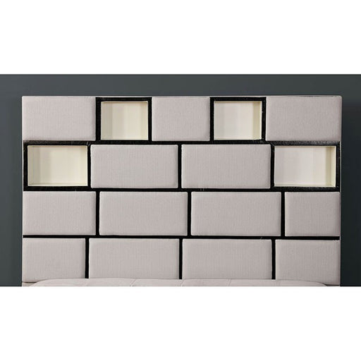 FOA EastGemma Beige/Black Cal.King Bed This is an absolutely dazzling bed. The sectional panels up fabric upholstering make for an unforgettable visual, an...